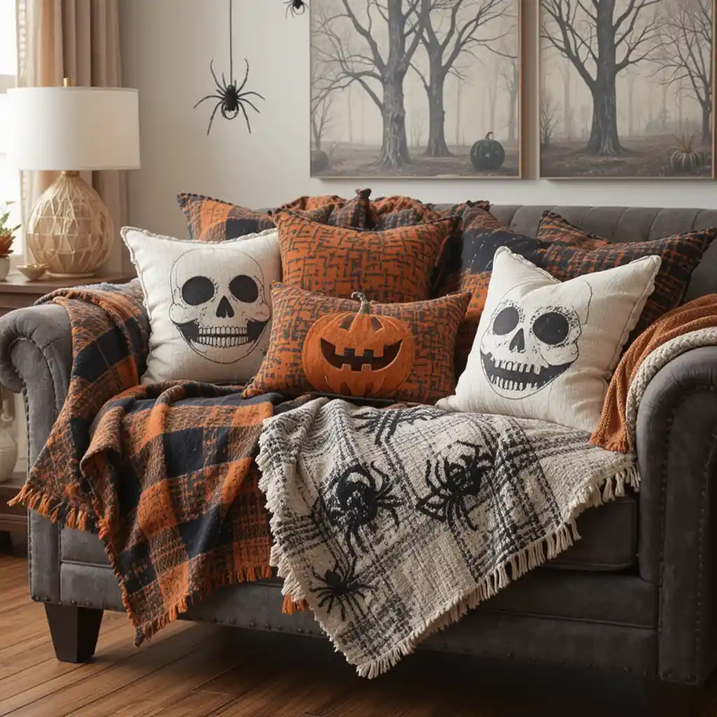 Balance out the spooky with comfort by adding plaid blankets, pumpkin pillows, and soft throws to your living room. Pair them with Halloween accents like skull cushions or spider-themed décor for a cozy yet festive finish.