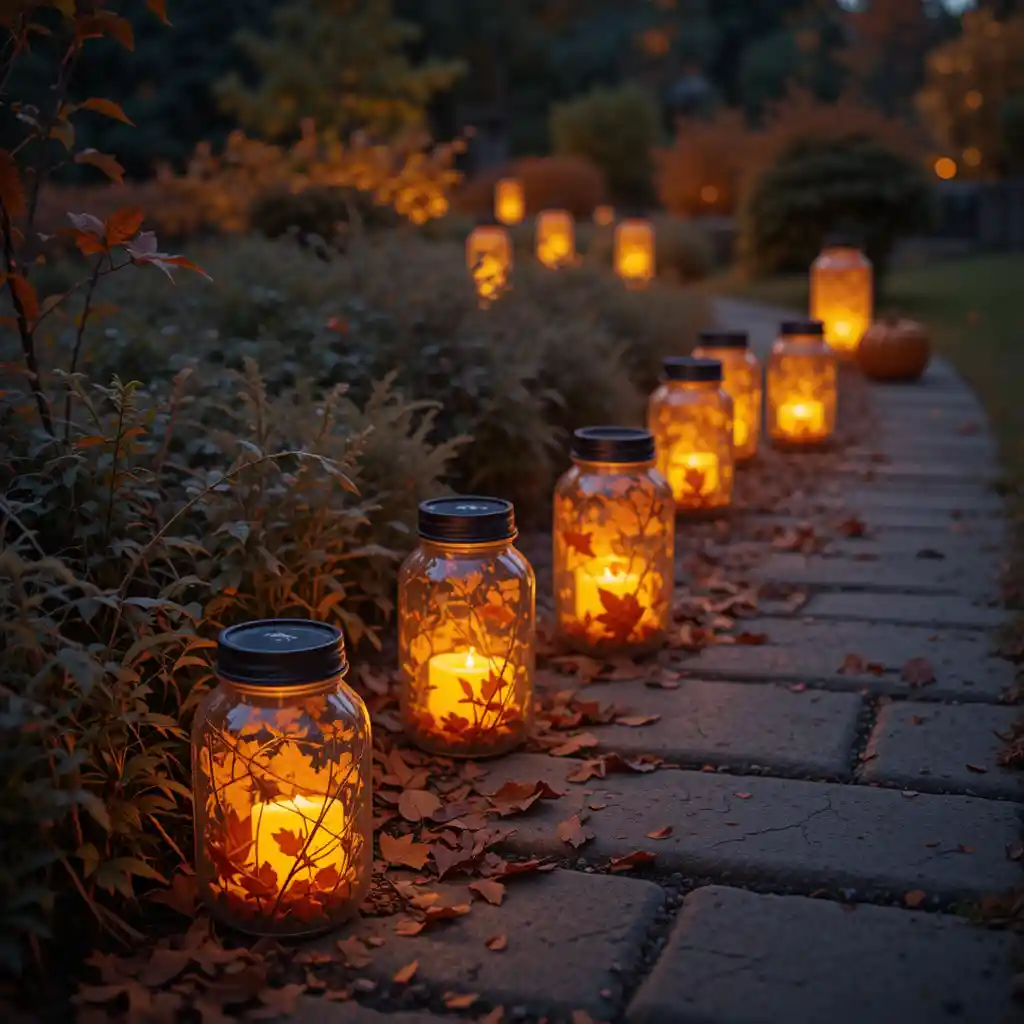Line your walkway with lanterns or mason jars filled with LED candles. Add a few mini pumpkins or fall leaves inside the jars to make the path festive and safe for Halloween night visitors.