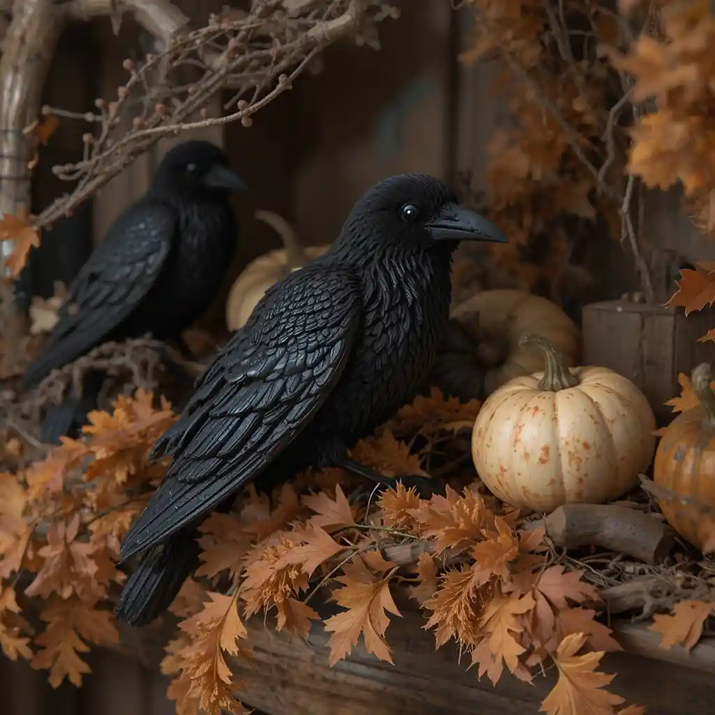 Add artificial black crows to mantels, bookshelves, or outdoor branches. These birds bring an eerie Halloween vibe while still blending perfectly with fall colors and natural elements.