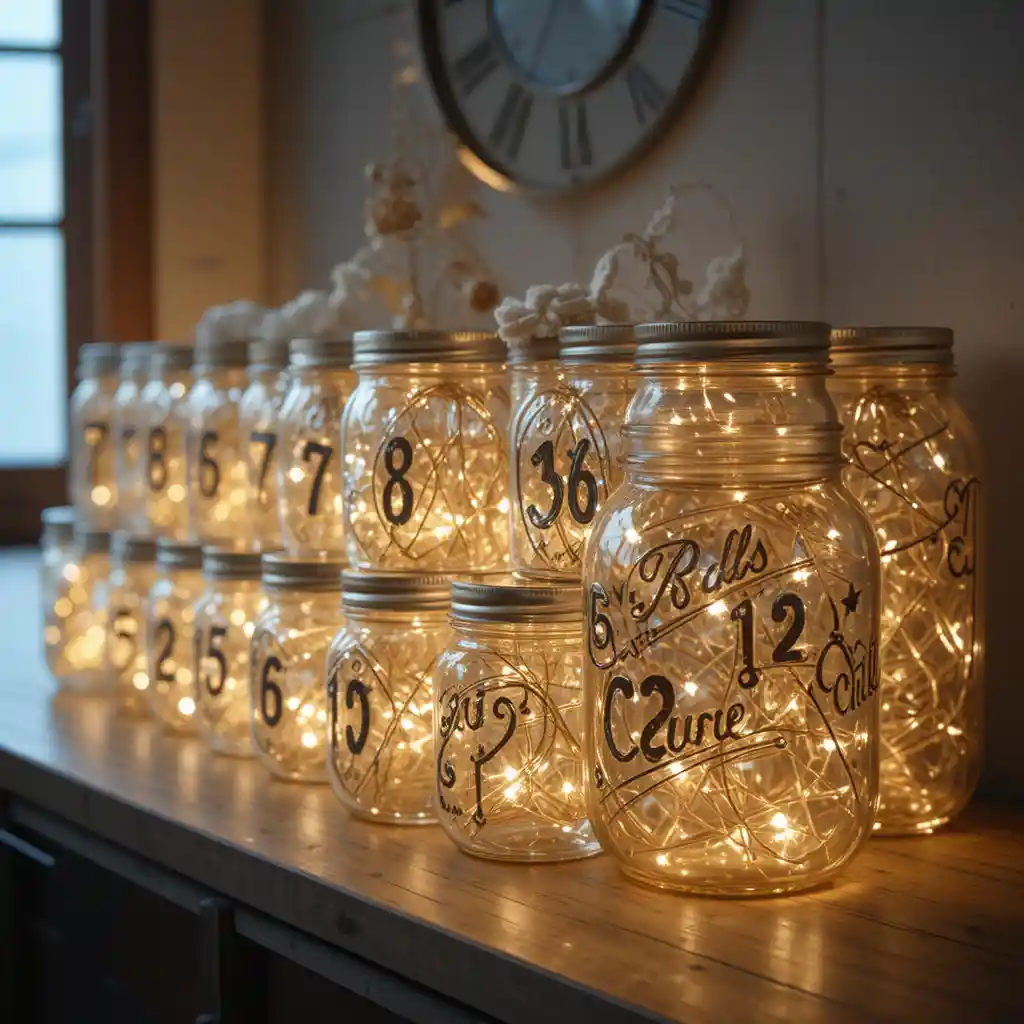 Fill 25 mason jars with fairy lights, labeled with numbers. Each evening, light up one more jar until all glow brightly on Christmas Eve. The growing sparkle enhances the magical atmosphere in any room.