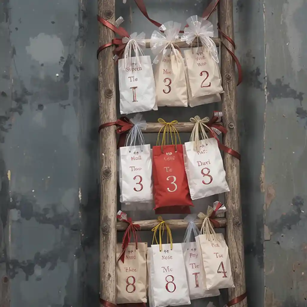 Hang numbered gift bags or envelopes along a decorative ladder tied with ribbons. This rustic-meets-modern décor piece makes a striking statement while keeping the countdown both stylish and functional.