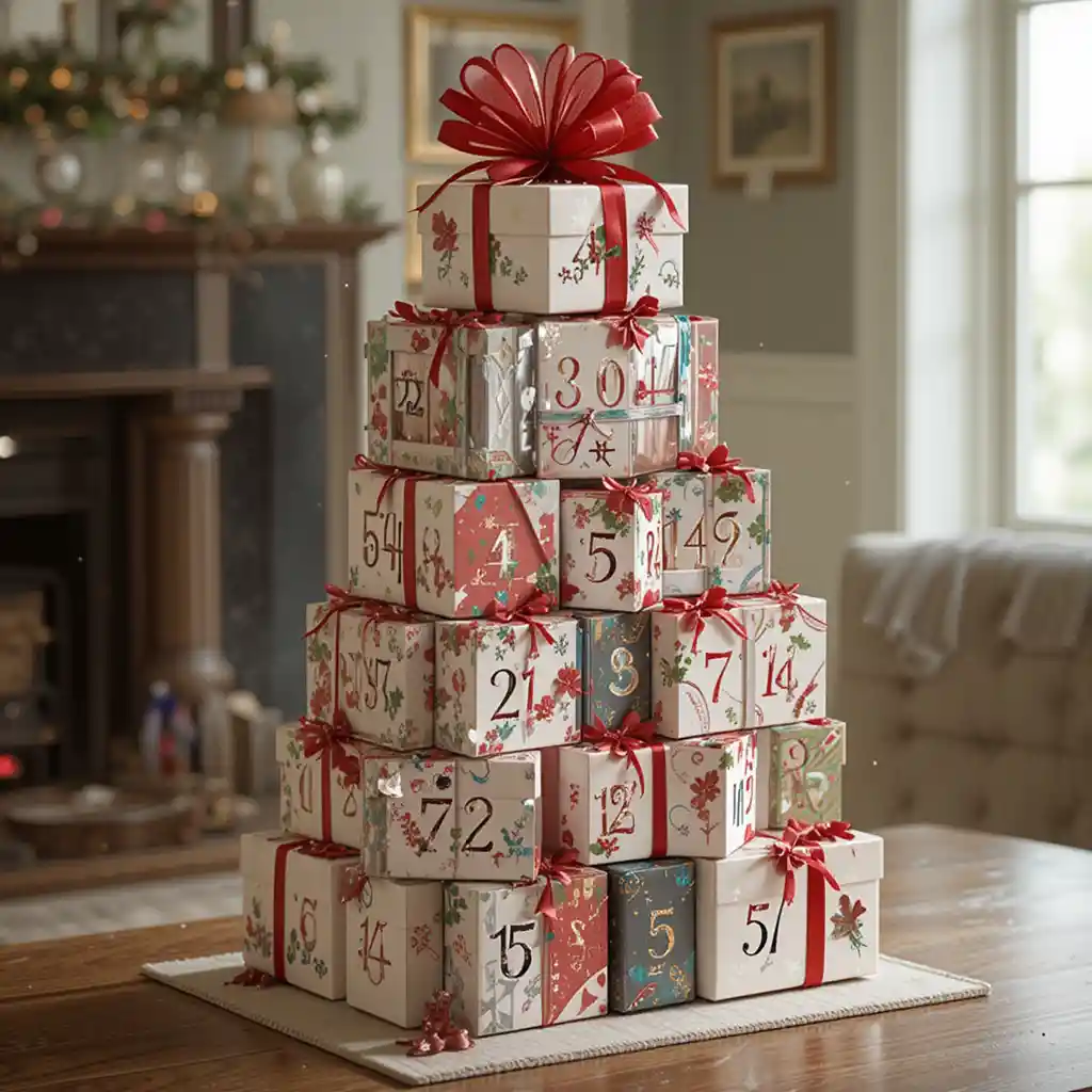 Stack small numbered gift boxes in the shape of a Christmas tree. Each day, open one to reveal a surprise. This decorative tower stands out as both an advent calendar and an elegant festive centerpiece.