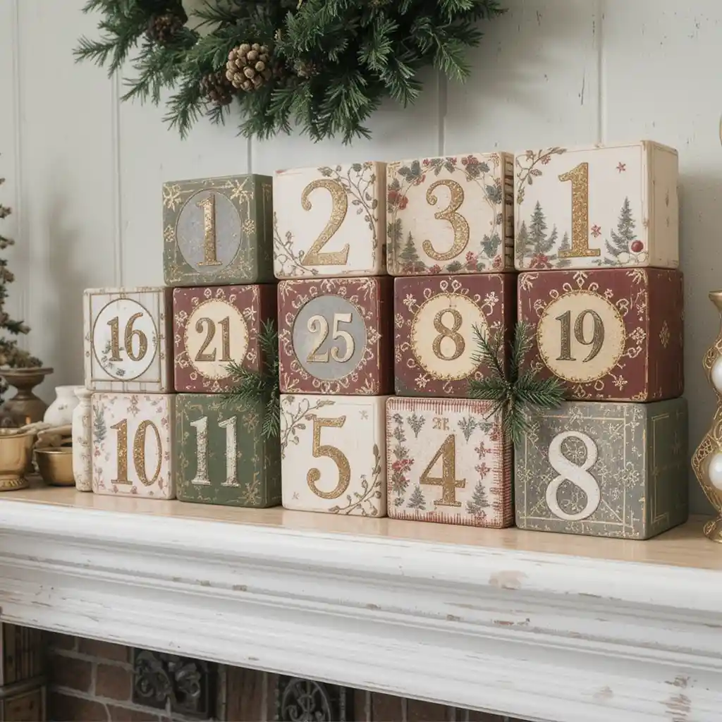 Painted wooden blocks arranged on a shelf or mantel can form a stylish countdown display. Each block can be rotated or flipped to reveal the correct date. Add glitter, gold accents, or Christmas patterns to make it eye-catching and timeless.