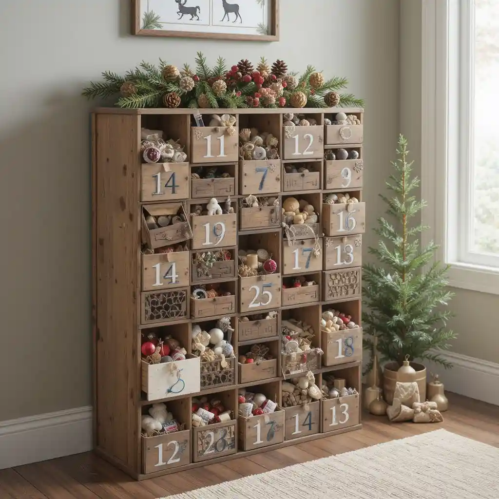 Stacked wooden crates with drawers or cubbies can be numbered 1 to 25 and filled with treats, ornaments, or messages. This farmhouse-inspired piece doubles as storage and festive décor, offering practicality with rustic elegance.