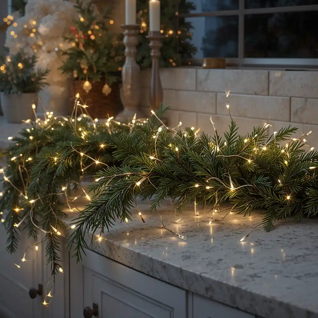Wrap twinkling fairy lights around a lush garland and spread it gracefully across your counter. This creates a soft golden glow that brings coziness to the room, while the greenery sets a natural backdrop for other holiday elements.