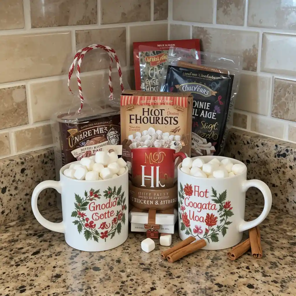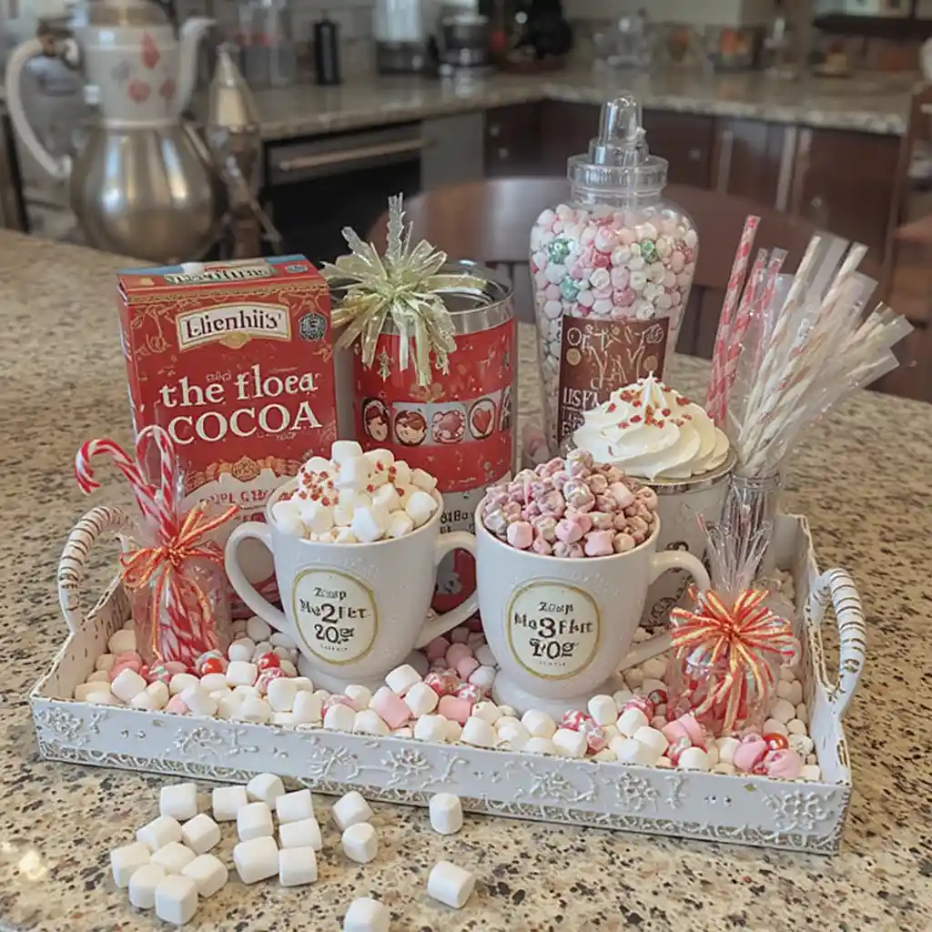 Create a small coffee or cocoa corner with holiday mugs, hot chocolate packets, marshmallows, and cinnamon sticks. This functional yet decorative idea keeps your counters festive and practical.