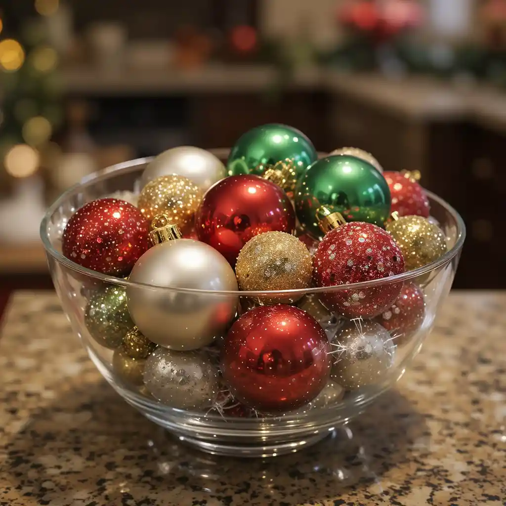 Fill a glass bowl with assorted ornaments in metallic tones, glitter, and classic reds and greens. This simple yet glamorous decoration instantly brings Christmas sparkle to your counter.