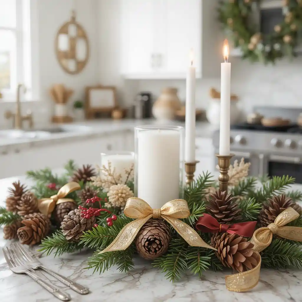Scatter pinecones across your counter and tie some with festive ribbons. This natural decoration idea feels earthy yet luxurious, especially with gold or red accents.