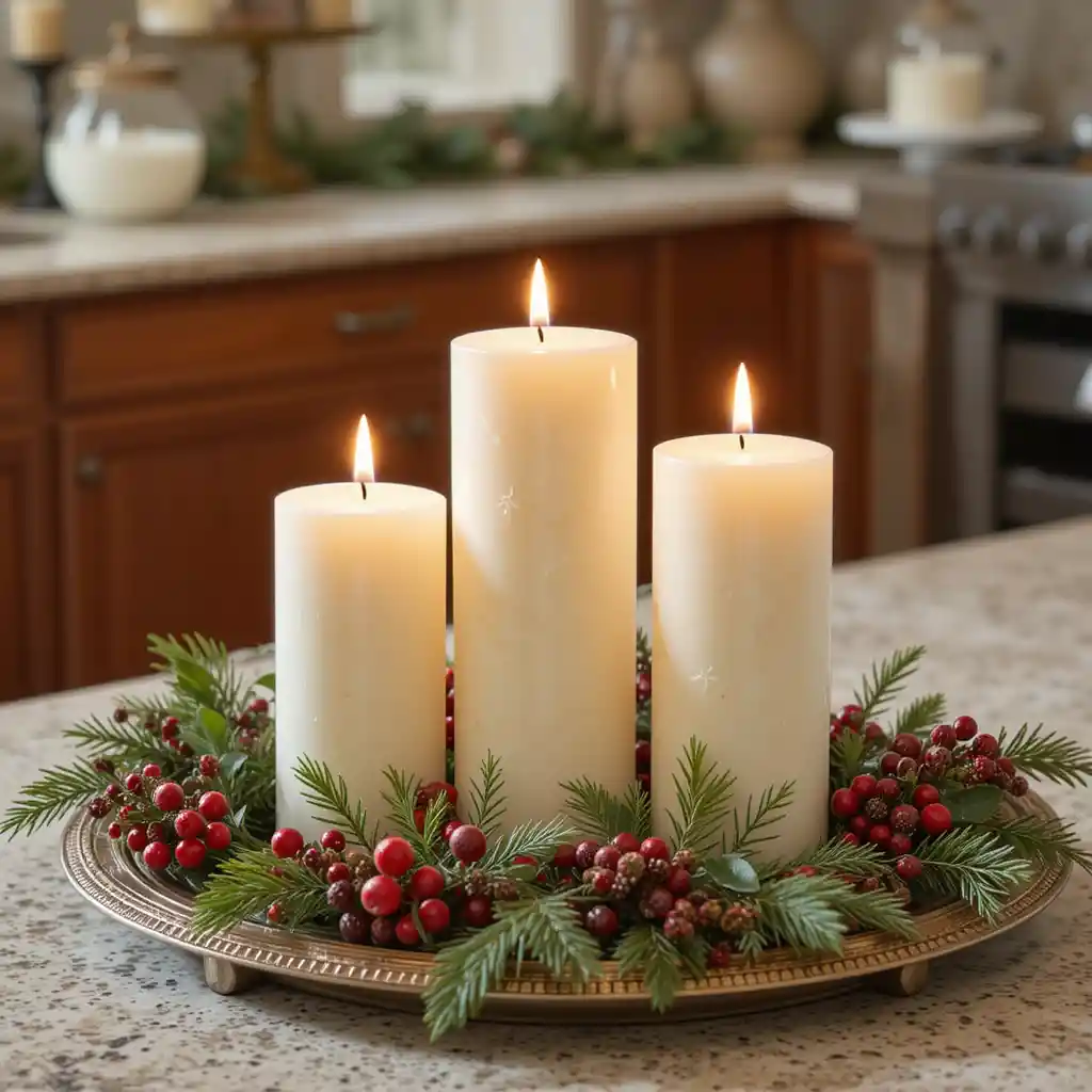 Arrange three candles of varying heights on a decorative tray, surrounded by berries and greenery. This simple setup makes your counter glow with festive elegance.
