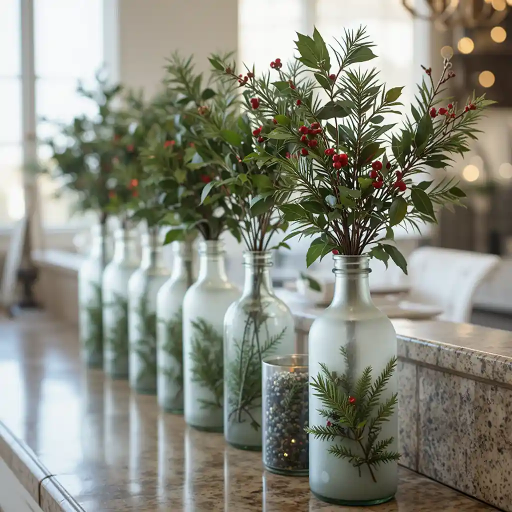 Use frosted glass bottles as vases and fill them with holly, mistletoe, or evergreen sprigs. Place them along the counter for a subtle yet refined Christmas touch.