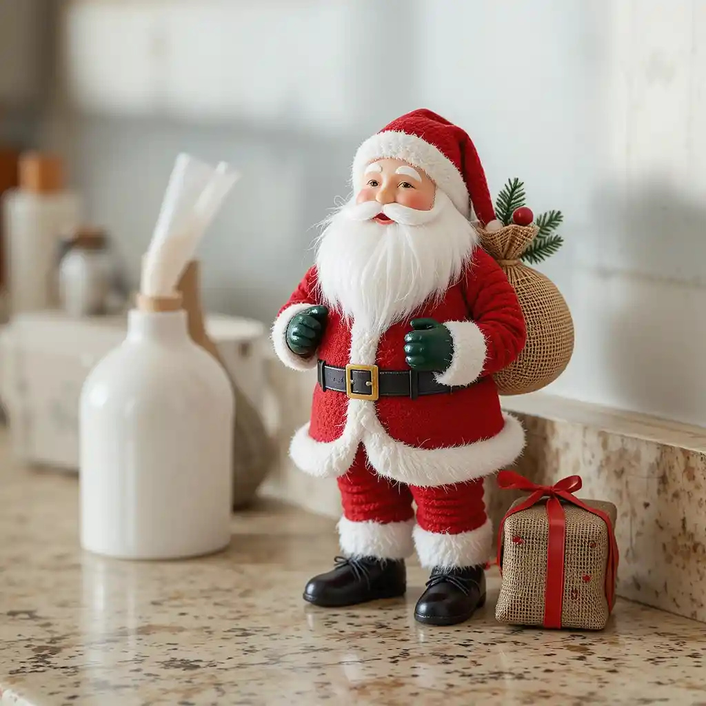 Add a cheerful Santa figurine with a small sack of gifts on the counter. It’s a playful decoration that adds a joyful spirit while keeping your counter lively.