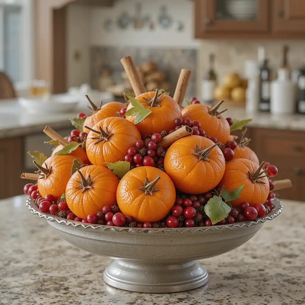 Arrange oranges studded with cloves, cinnamon sticks, and cranberries in a bowl. This decoration not only looks festive but also fills your kitchen with a delightful holiday scent.