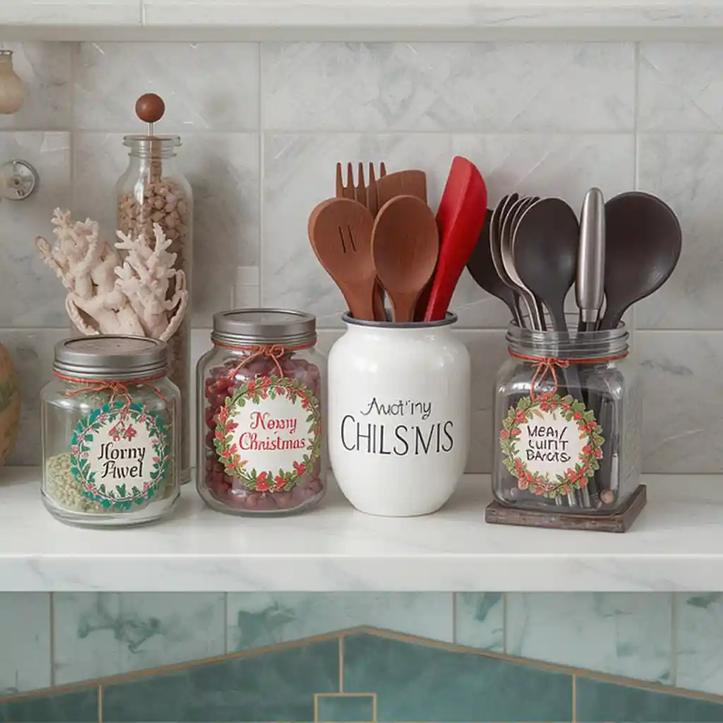 Replace everyday kitchen essentials with holiday-themed versions, like Christmas towels, jar labels, and utensil holders. This subtle yet stylish swap keeps your counters cheerful all season long.