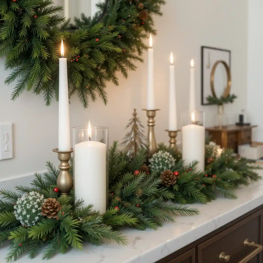 Pair tall candles with fresh evergreen branches. The contrast between flickering candlelight and natural greenery creates an elegant and timeless Christmas look on your counter.