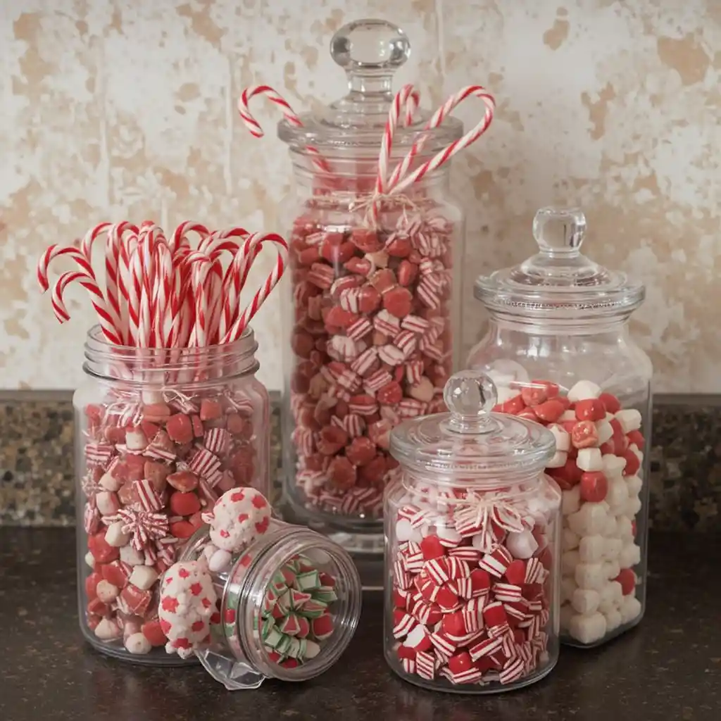 Fill clear glass jars with candy canes, peppermint sticks, and red-and-white treats. This decoration doubles as a snack station while giving your counters a sweet festive charm.