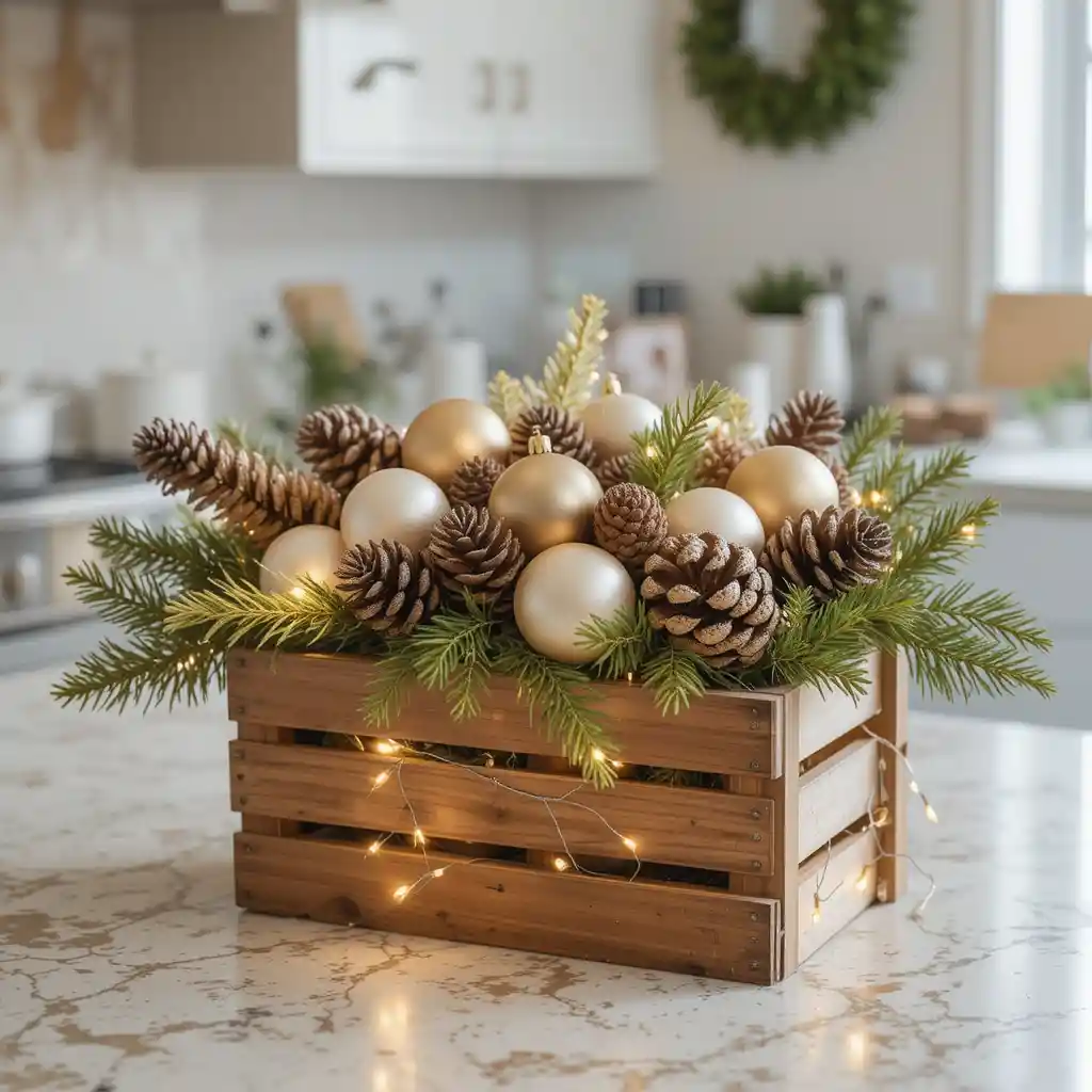 Place a small wooden crate on the counter and fill it with ornaments, pinecones, string lights. This rustic touch feels warm, welcoming, and perfect for farmhouse-style Christmas décor.