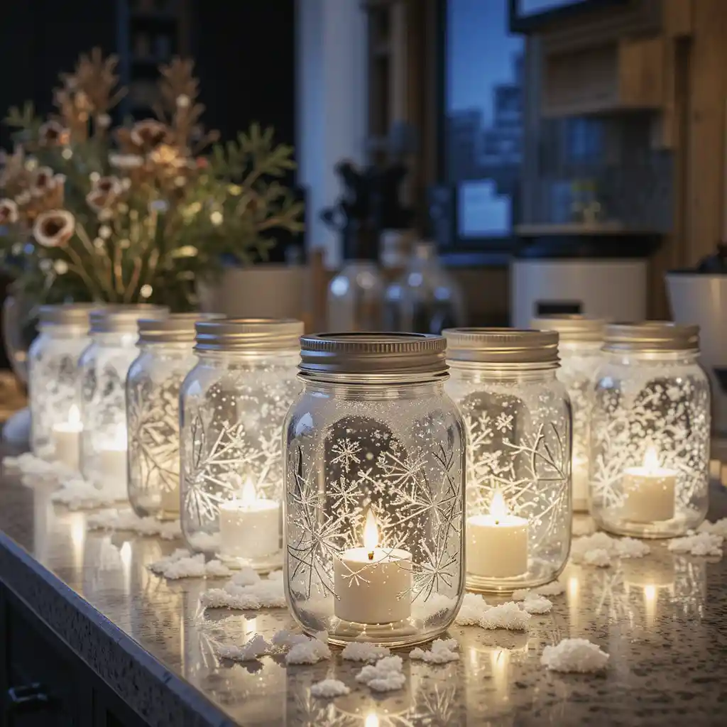 Coat mason jars with frosty paint or artificial snow spray, then add tea lights inside. Place them across your counter for a cozy snowy effect that shines brightly in dim lighting.