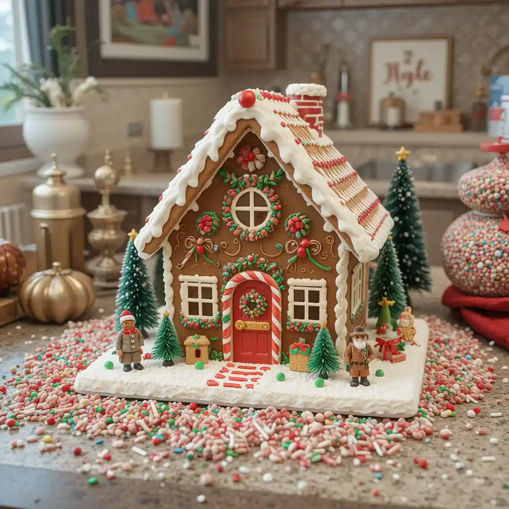Build or buy a gingerbread house and place it as the centerpiece of your counter. Surround it with sprinkles, candy accents, and mini figurines for a playful Christmas touch.