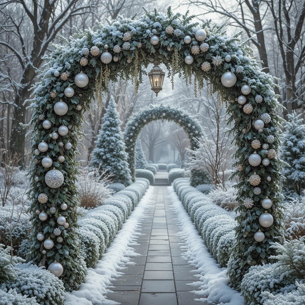 Create a statement with a garden arch wrapped in garlands, ornaments, and frosted details. Walking through such an archway feels like stepping into a magical winter storybook.