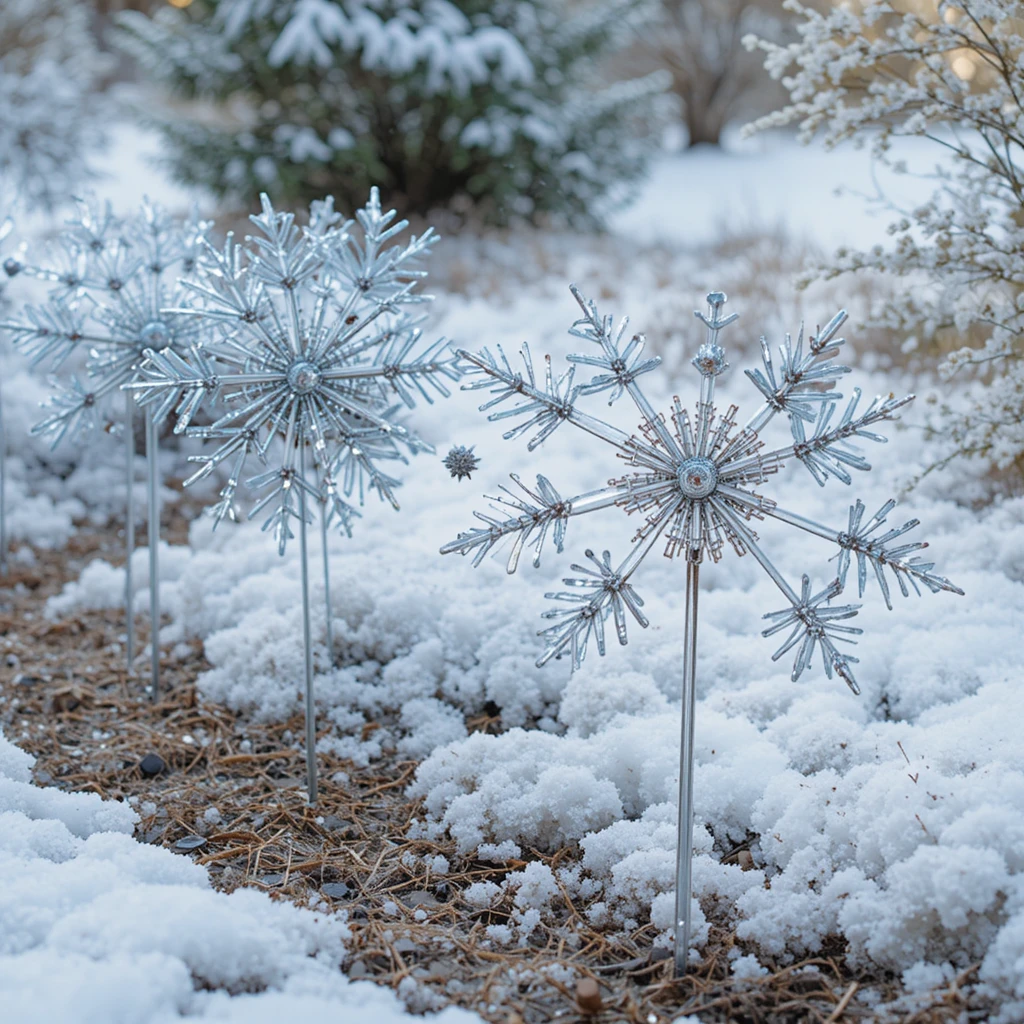 Add decorative stakes shaped like snowflakes or stars along your pathways. Their reflective surfaces and winter-themed designs guide the way while enhancing your outdoor aesthetic.