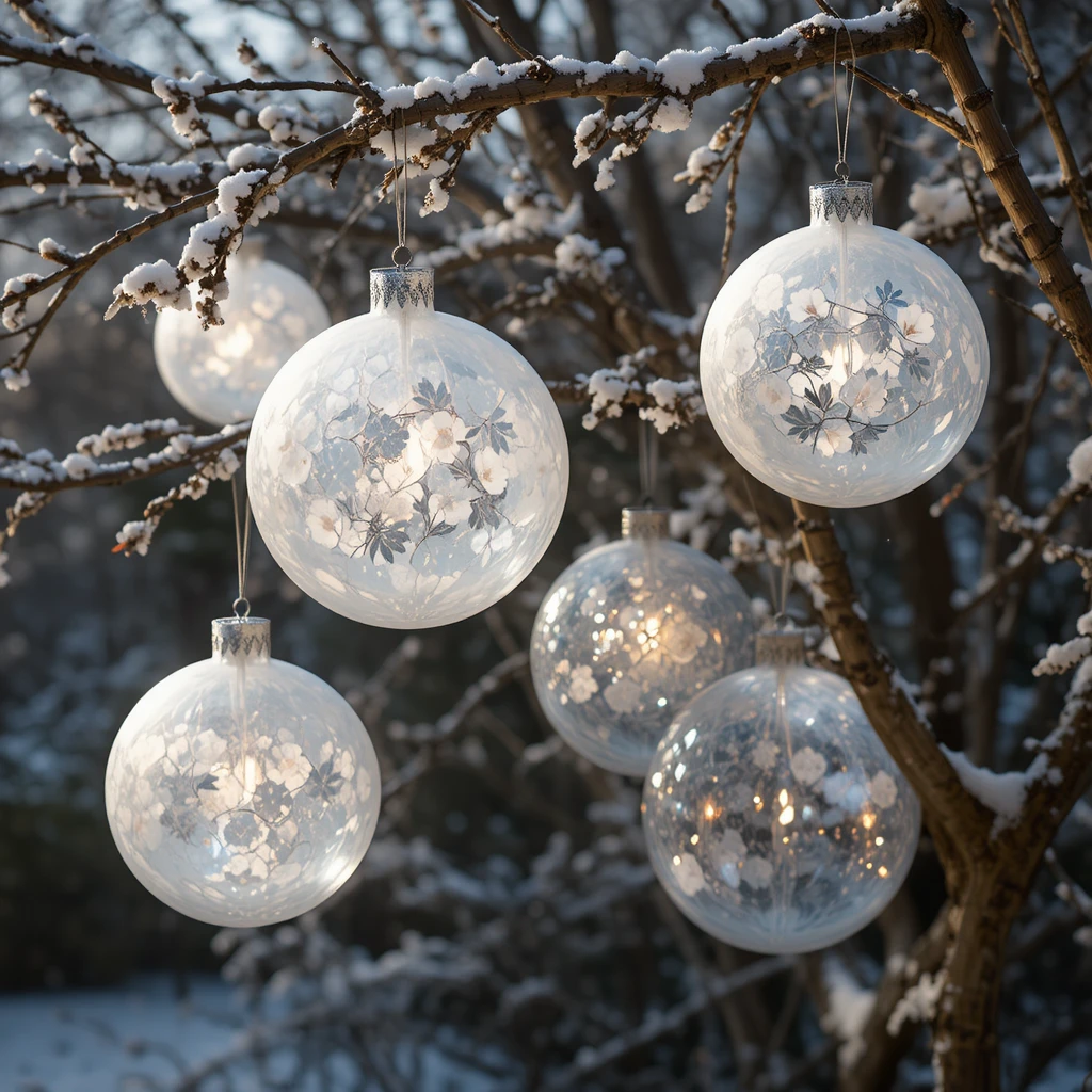 Hang oversized frosted or silver ornaments from tree branches. The shimmering effect creates a wintry sparkle, especially when touched by sunlight or illuminated at night.