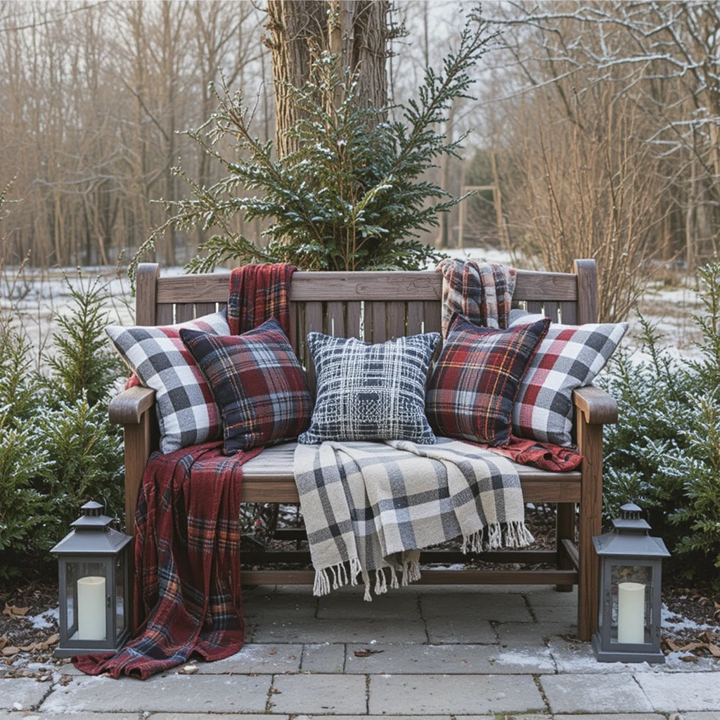 Style a garden bench with plaid blankets, cushions, and lanterns on either side. Even when not in use, this styled corner creates a cozy, picturesque look for your winter garden.