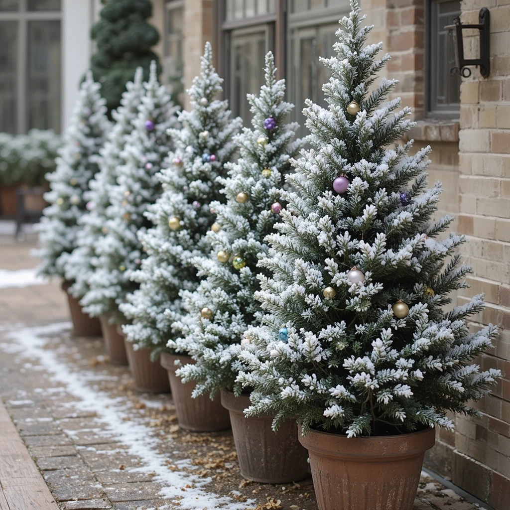 Arrange small potted evergreens along pathways or near entrances. Spray them with artificial snow and decorate with mini baubles to create a welcoming and festive display.