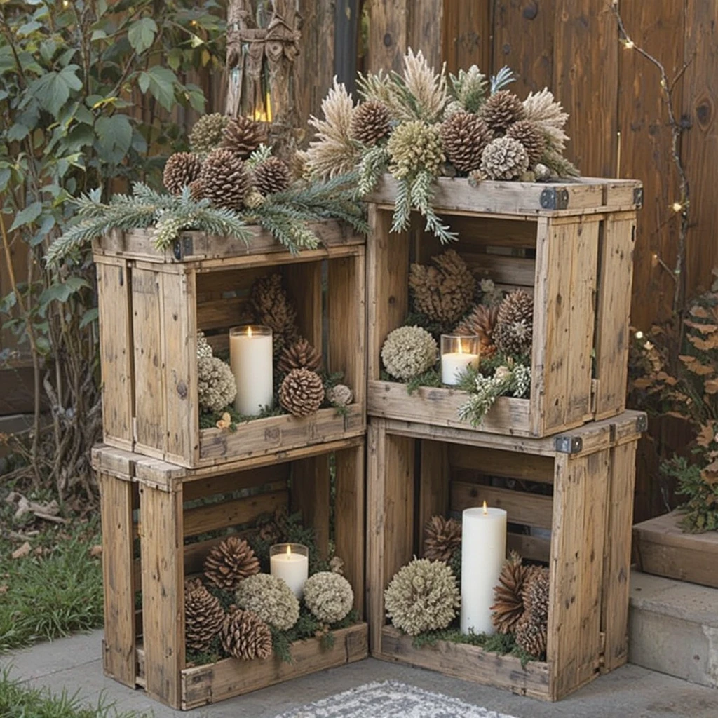Stack rustic wooden crates and fill them with pinecones, candles, or winter flowers. This creative corner serves as a seasonal display that feels both eco-friendly and stylish.
