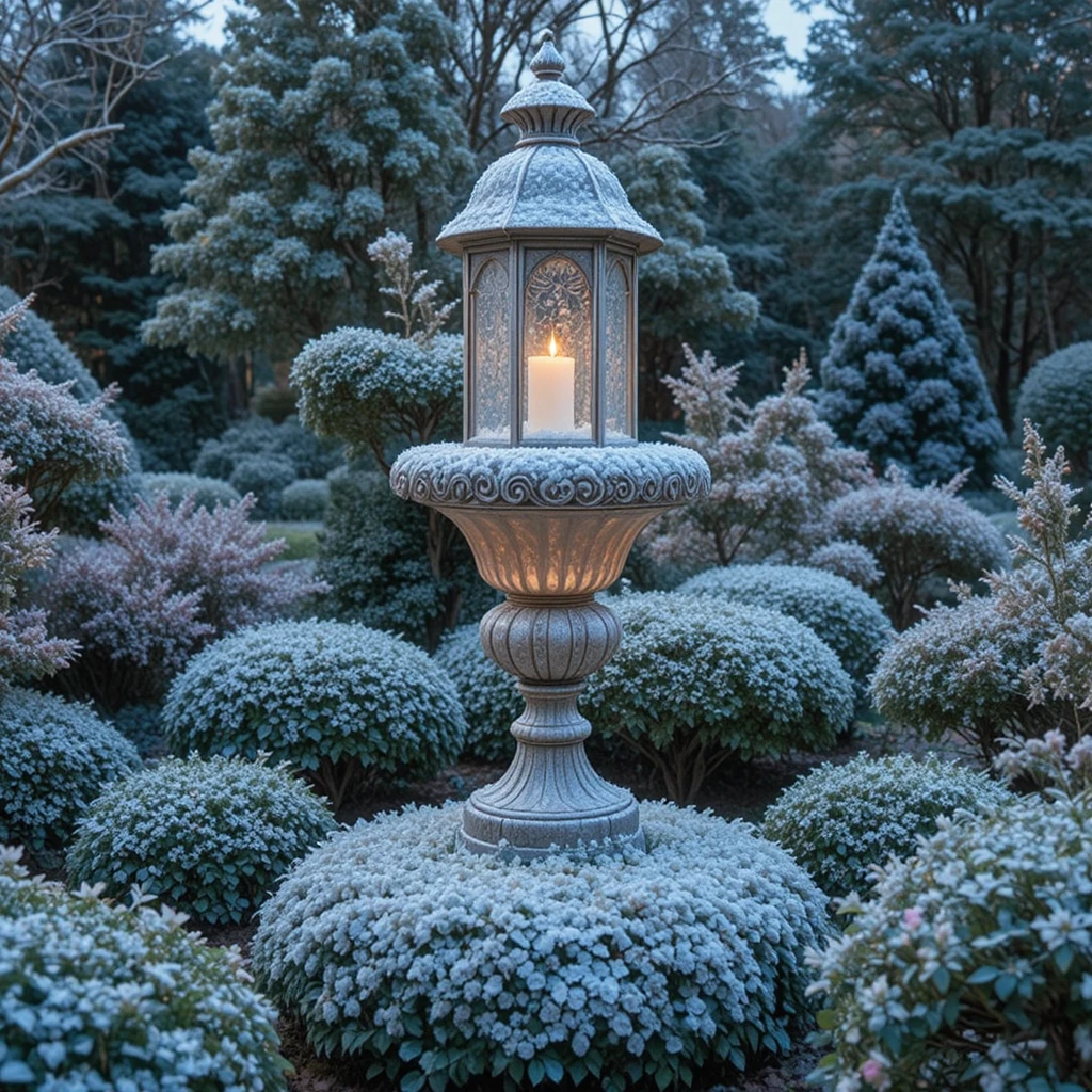 Place a large decorative centerpiece such as a frosted lantern, vintage urn, or lighted sculpture in the heart of your garden. This bold focal point ties together all the winter garden decoration ideas into a cohesive, stunning presentation.