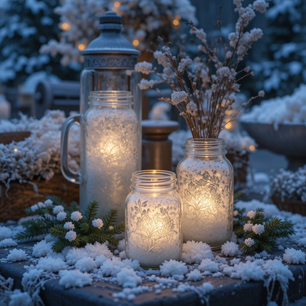 Use frosted mason jars as candle holders and place them on tables or walls. Their icy texture blends beautifully with winter surroundings, creating a soft glow perfect for evening garden gatherings.