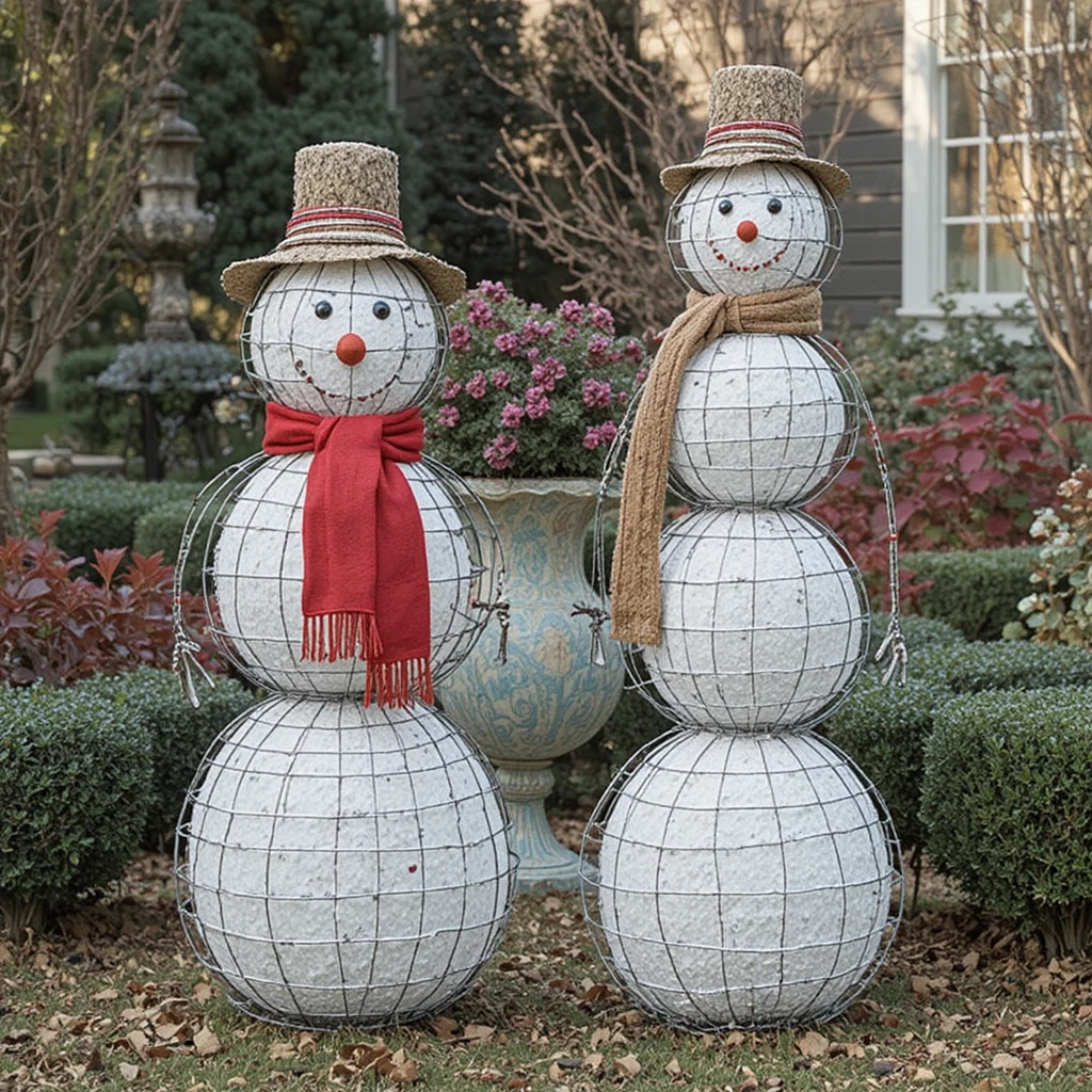 Replace traditional plant topiaries with snowman-shaped designs using wire frames, artificial snow spray, and scarves. These playful figures add a cheerful touch to your garden landscape.