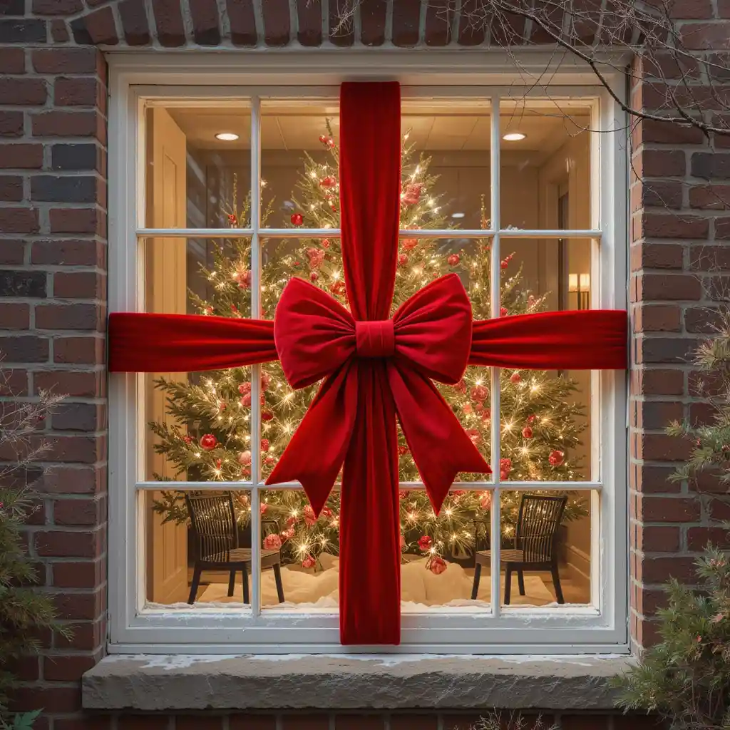 Place oversized velvet or satin bows at each corner of your window. Their rich texture and festive colors instantly elevate your window decor with elegance and grandeur.