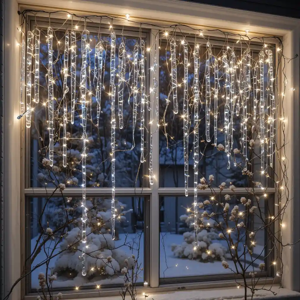 Hang icicle-style string lights across the top of your window for a cascading glow. They shimmer with a snowy charm, creating the perfect wintery atmosphere both indoors and outdoors.