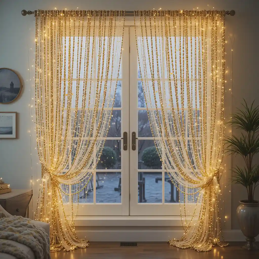 Replace or layer your curtains with golden bead strings. The shimmering beads dance with light, giving your window decor a glamorous and festive sparkle fit for a holiday party.