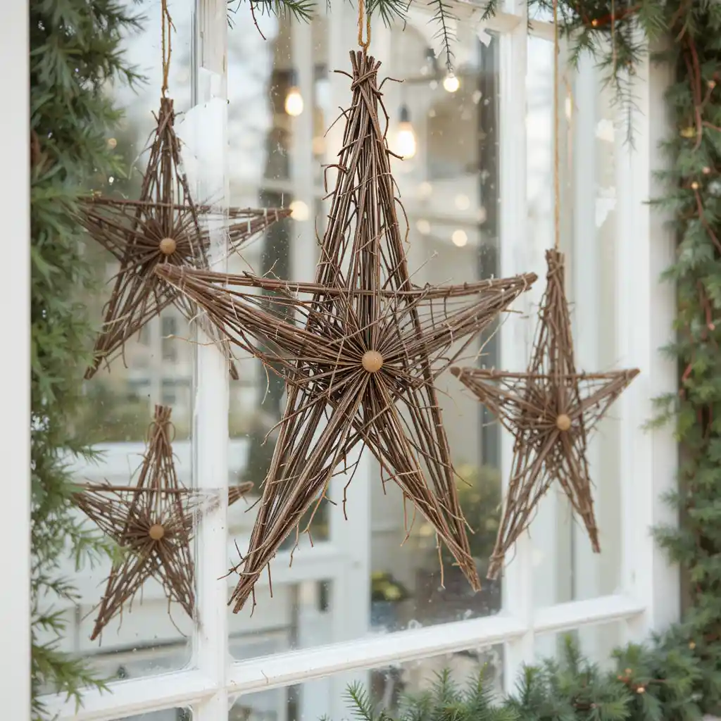 Craft large stars using twigs and twine, then hang them across the window. Their rustic look blends beautifully with greenery and adds a natural, handmade holiday accent.