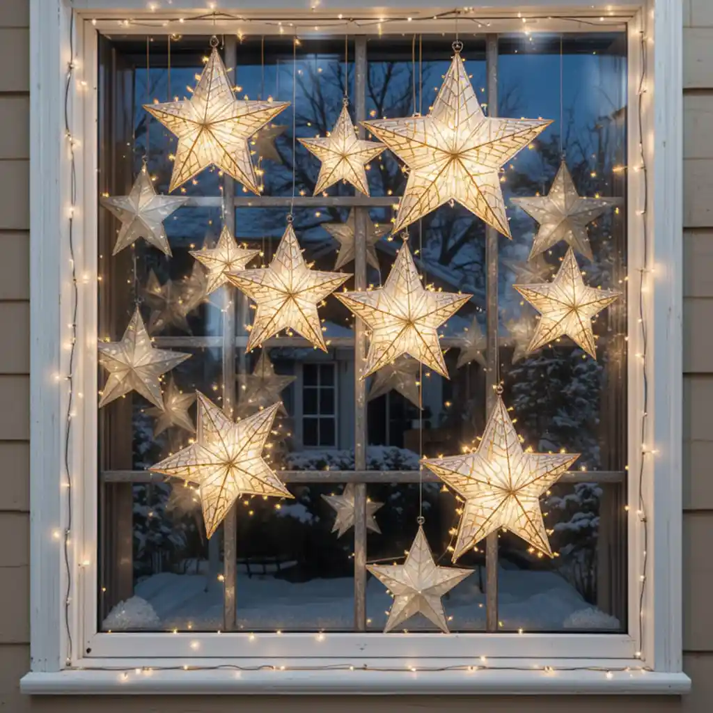 Star-shaped paper lanterns with LED lights create a celestial charm. Place them in various sizes across your window to give an elegant holiday vibe that twinkles with warmth, especially when viewed from outdoors.
