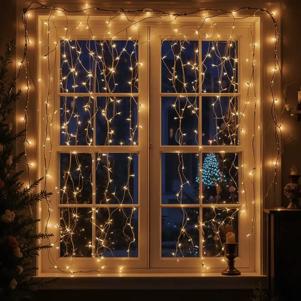 Hang a curtain of fairy lights over your window for a dazzling look. The soft glow enhances indoor warmth while offering a breathtaking holiday display visible from outside.