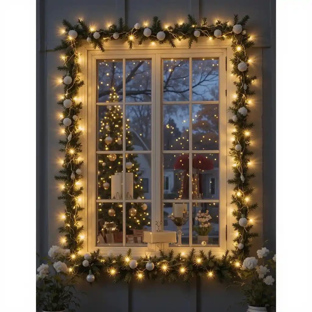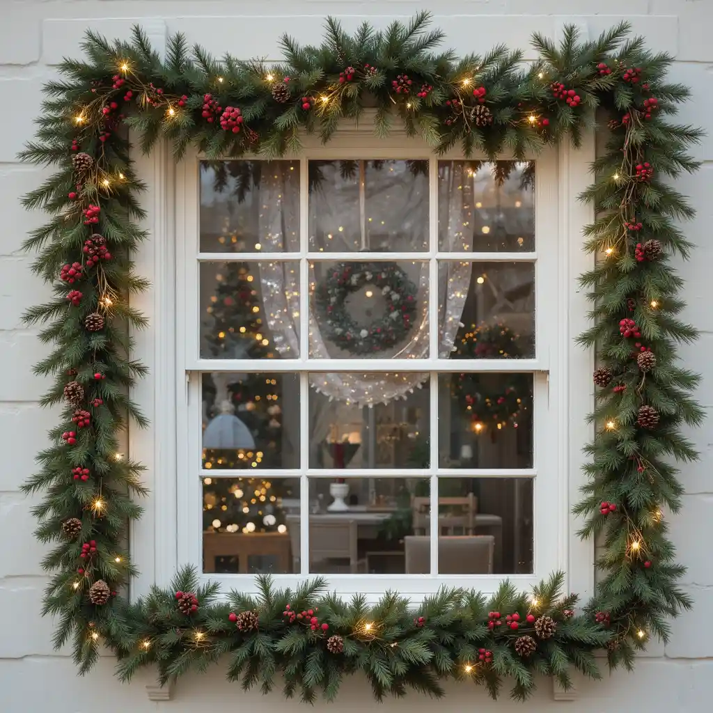 Drape fresh pine garlands around your window frame and enhance them with red berries, pinecones, and fairy lights. This idea brings a rustic woodland aesthetic, blending natural textures with festive sparkle.