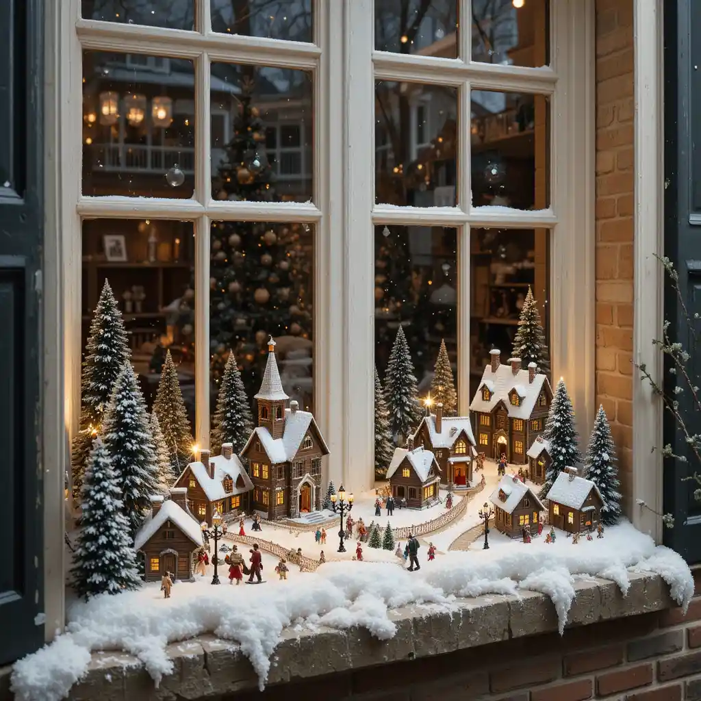 Set up a miniature Christmas village scene on your window ledge. Small figurines, snowy rooftops, and little lampposts capture the holiday essence beautifully, making it appear like a storybook scene.