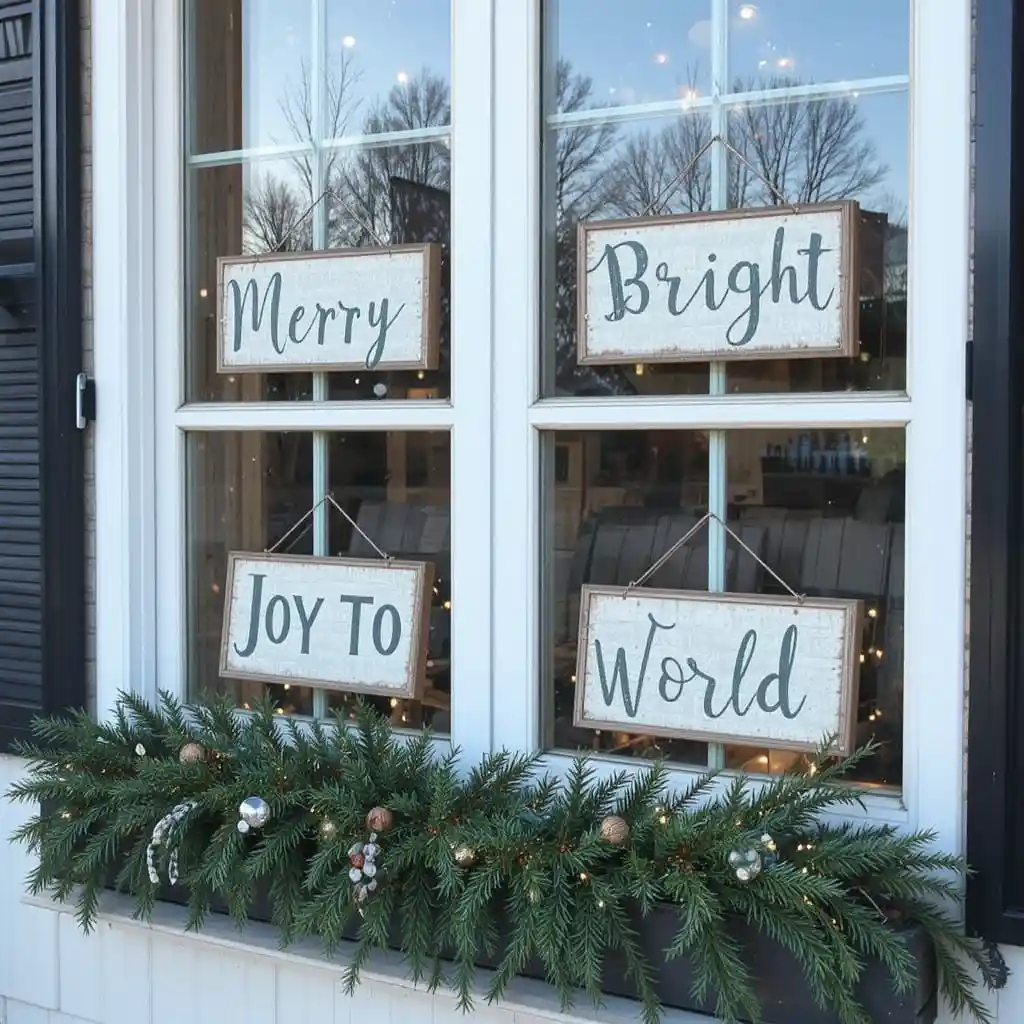 Wooden signs painted with phrases like “Merry & Bright” or “Joy to the World” instantly enhance your window decor. Pair them with greenery or string lights for a farmhouse-style holiday display.