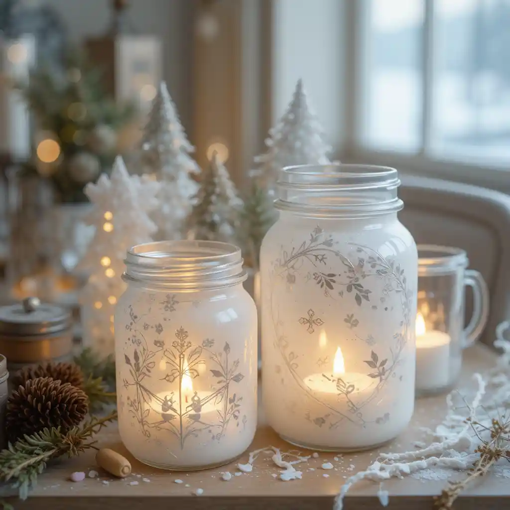 Repurpose glass jars by frosting them lightly and placing tea lights inside. The soft diffused glow adds gentle illumination, creating a warm, hygge-inspired holiday atmosphere.