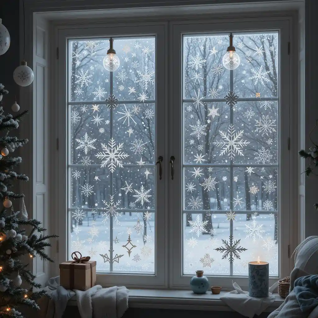 Add a winter touch to your windows using snow spray or adhesive decals in Nordic-inspired patterns like stars, snowflakes, and geometric shapes. It’s a delicate way to bring frosty charm indoors.