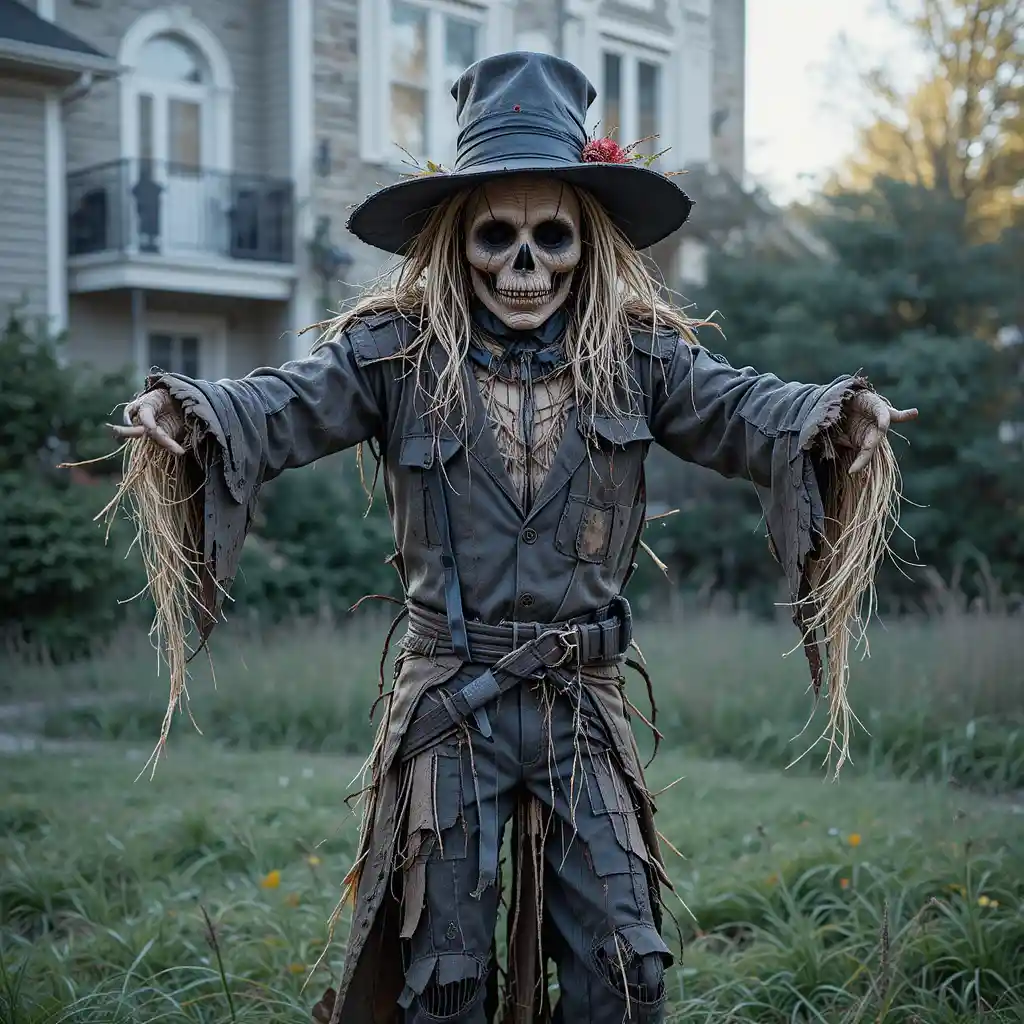 A traditional scarecrow can easily be given a Halloween twist. Use tattered clothing, a sinister mask, and straw stuffing to make it more menacing.