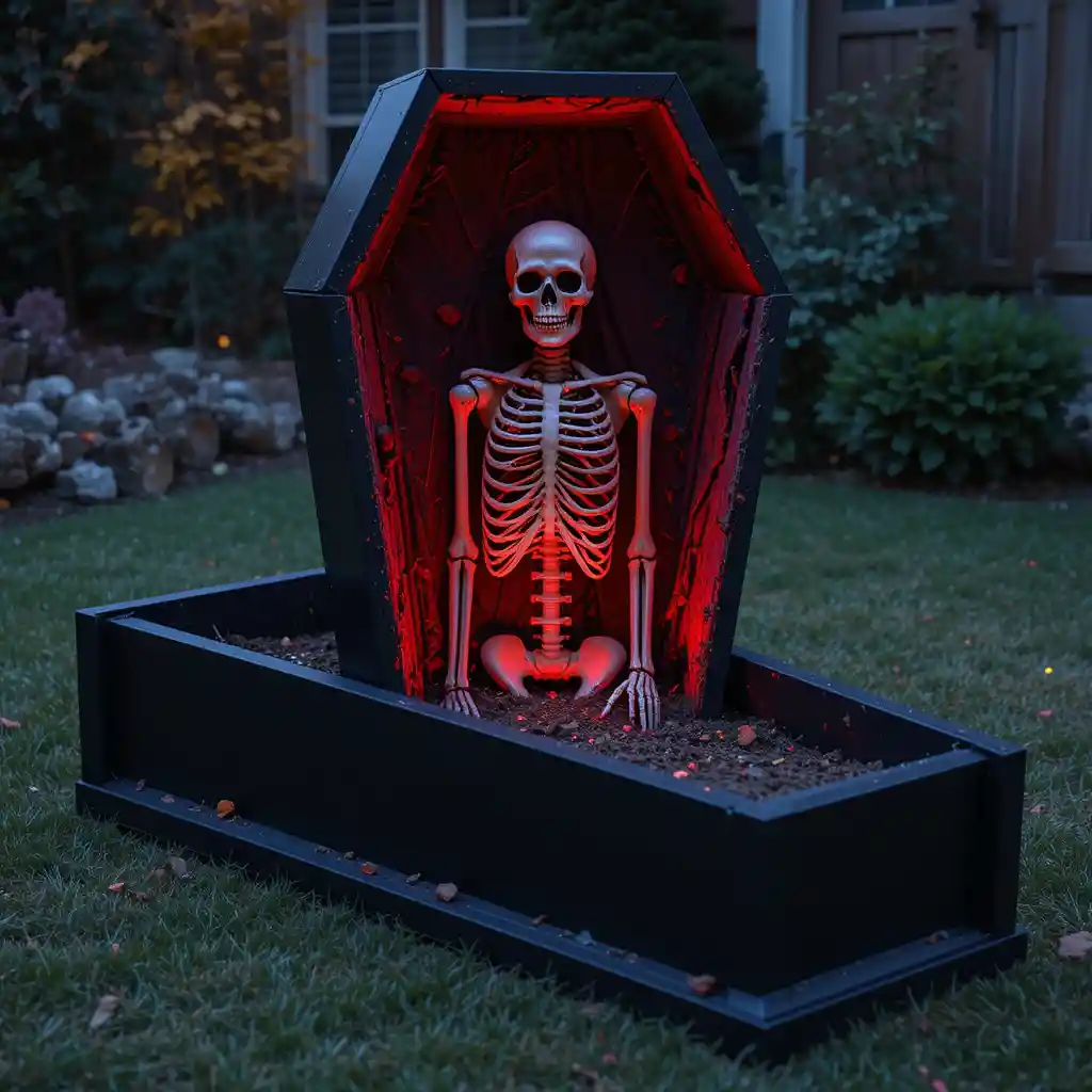 Build or purchase a coffin prop and stage it slightly open with a skeleton peeking out. This centerpiece can be illuminated with dim red lighting for a dramatic flair.