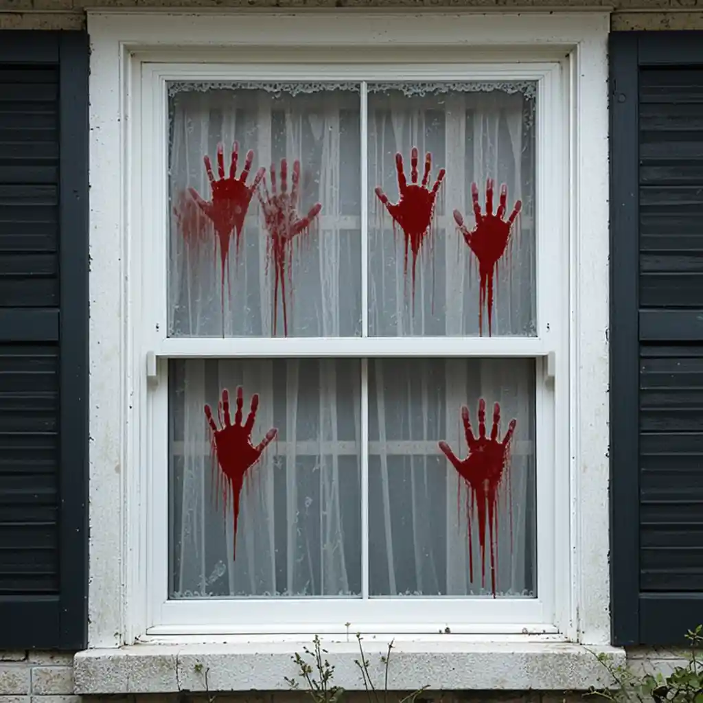 For a chilling touch, add removable decals of bloody handprints and streaks across windows facing the yard. This subtle detail enhances the overall haunted effect.