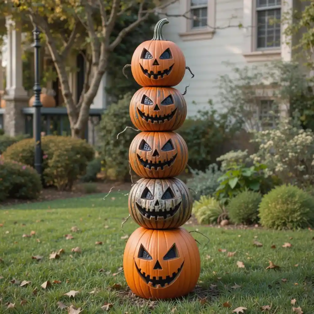 Stack pumpkins of varying sizes to create a totem-like structure. Carve eerie faces or paint them black and white for a more artistic yard Halloween decoration.