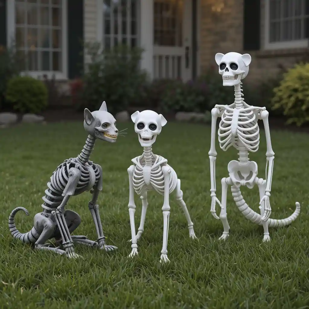Use skeleton dogs, cats, or even snakes to decorate your lawn. Position them as though they’re guarding the yard, adding a humorous yet creepy element.