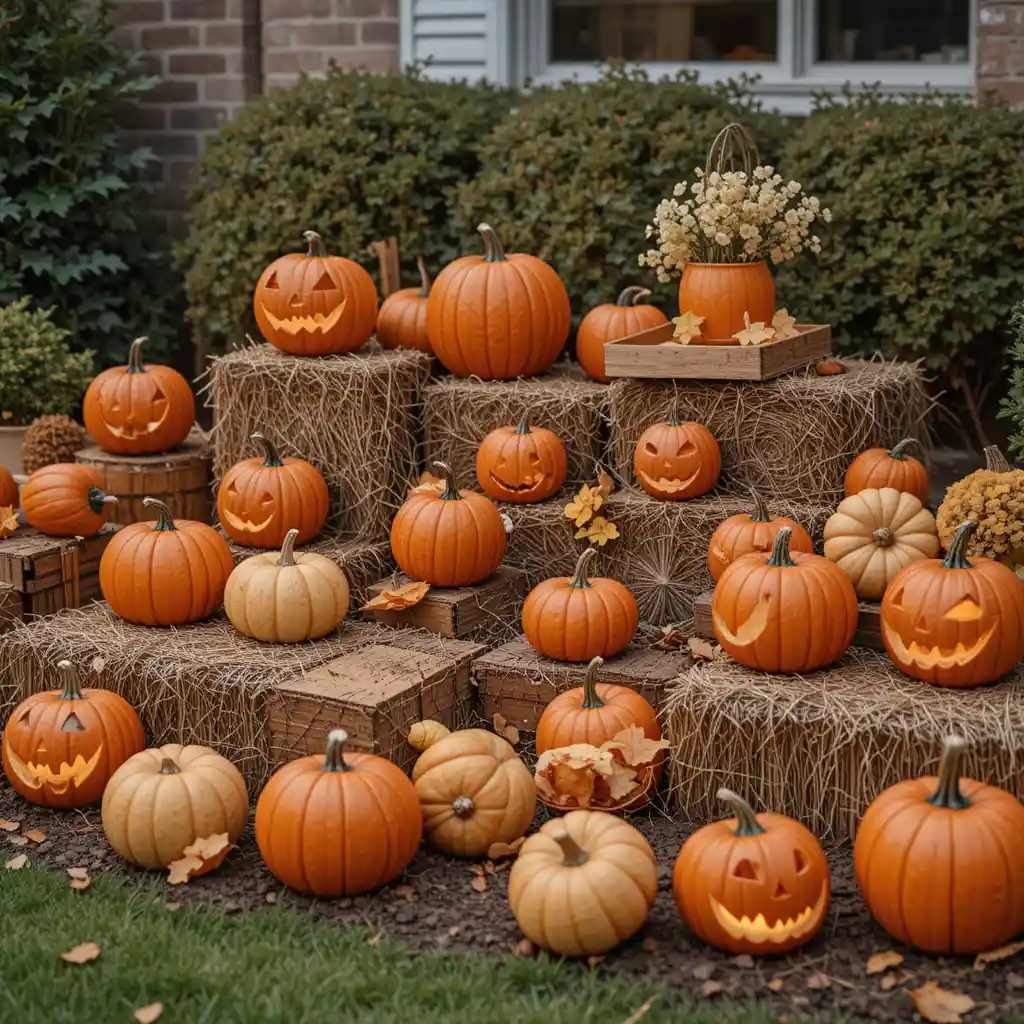 Create a family-friendly vibe with a mini pumpkin patch. Mix carved jack-o’-lanterns with uncarved pumpkins and hay bales for a warm yet festive outdoor look.