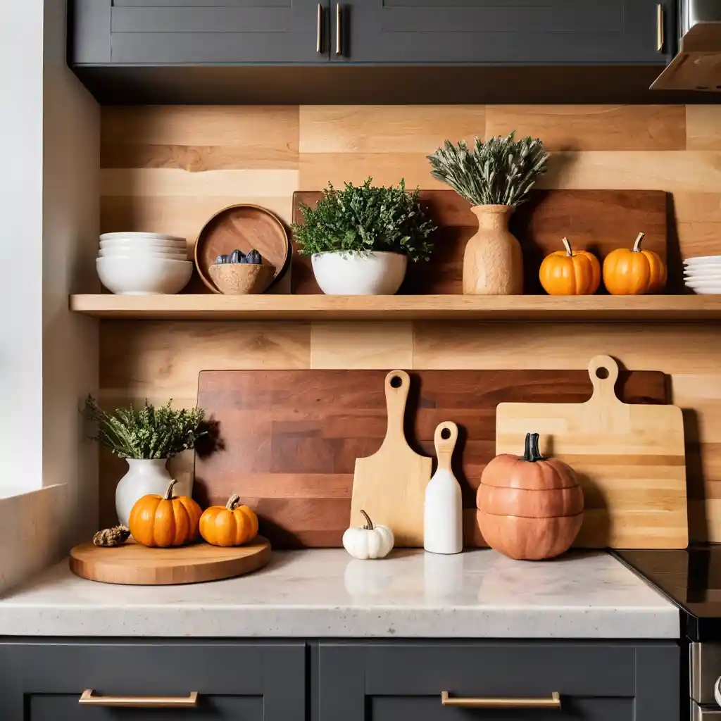 Layer a few wooden cutting boards against your backsplash. Their natural wood grain adds warmth and texture perfect for fall.