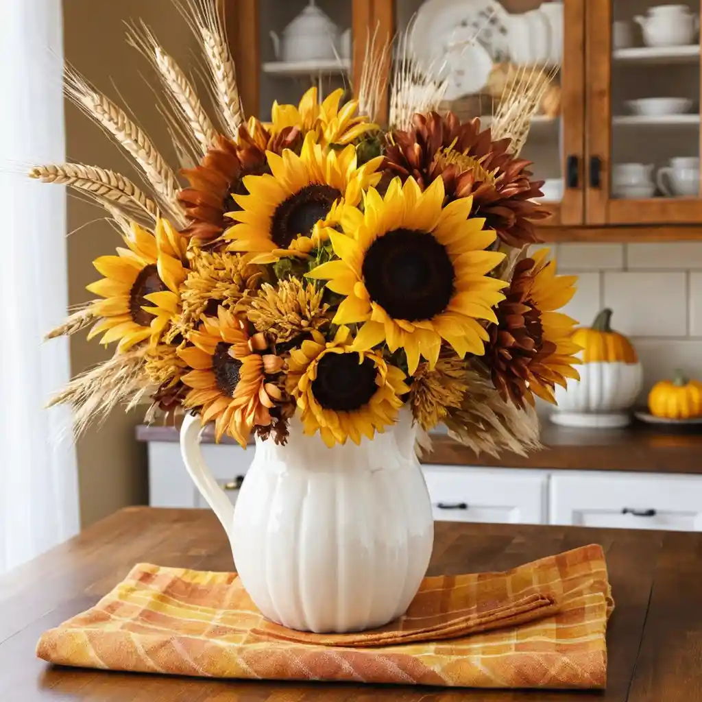 Arrange sunflowers, mums, and dried wheat in a ceramic pitcher for a country-chic floral display.